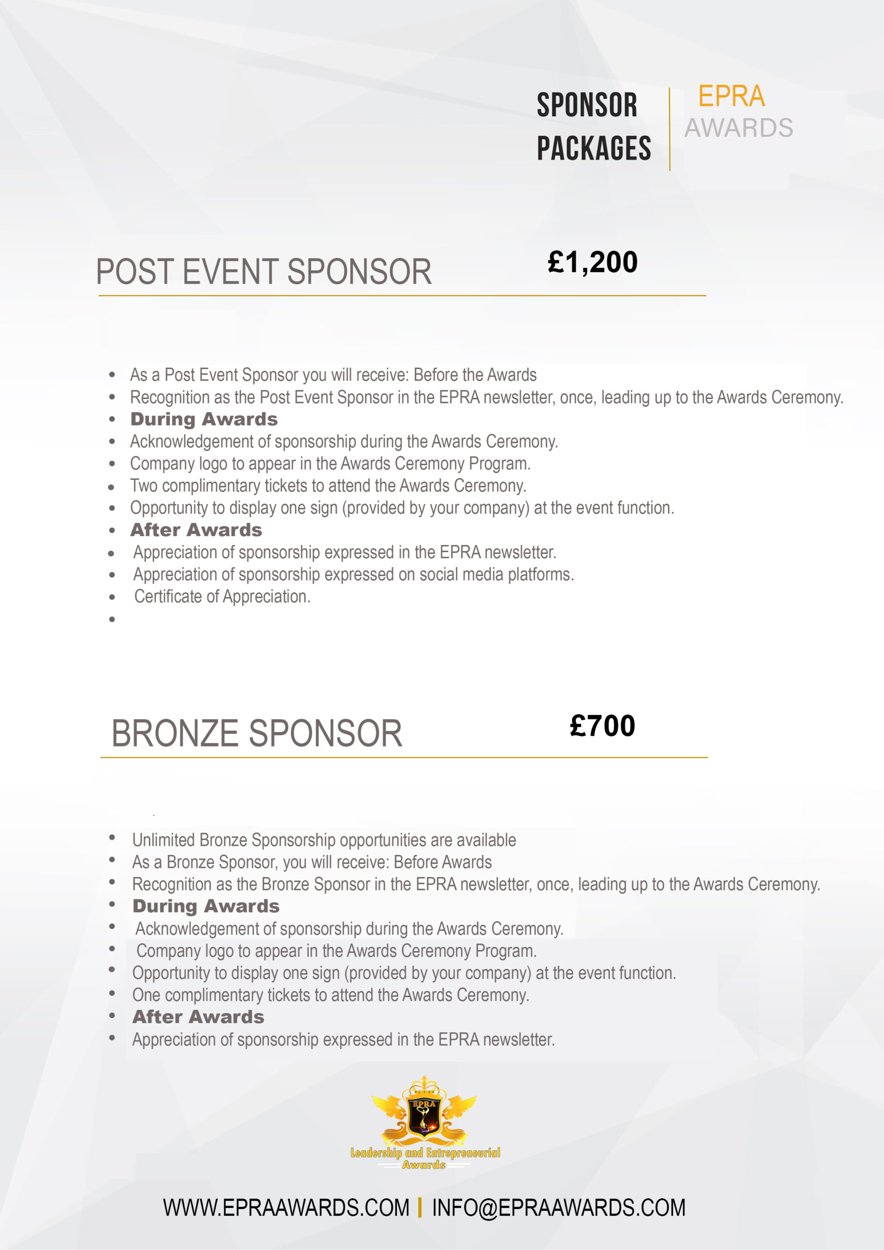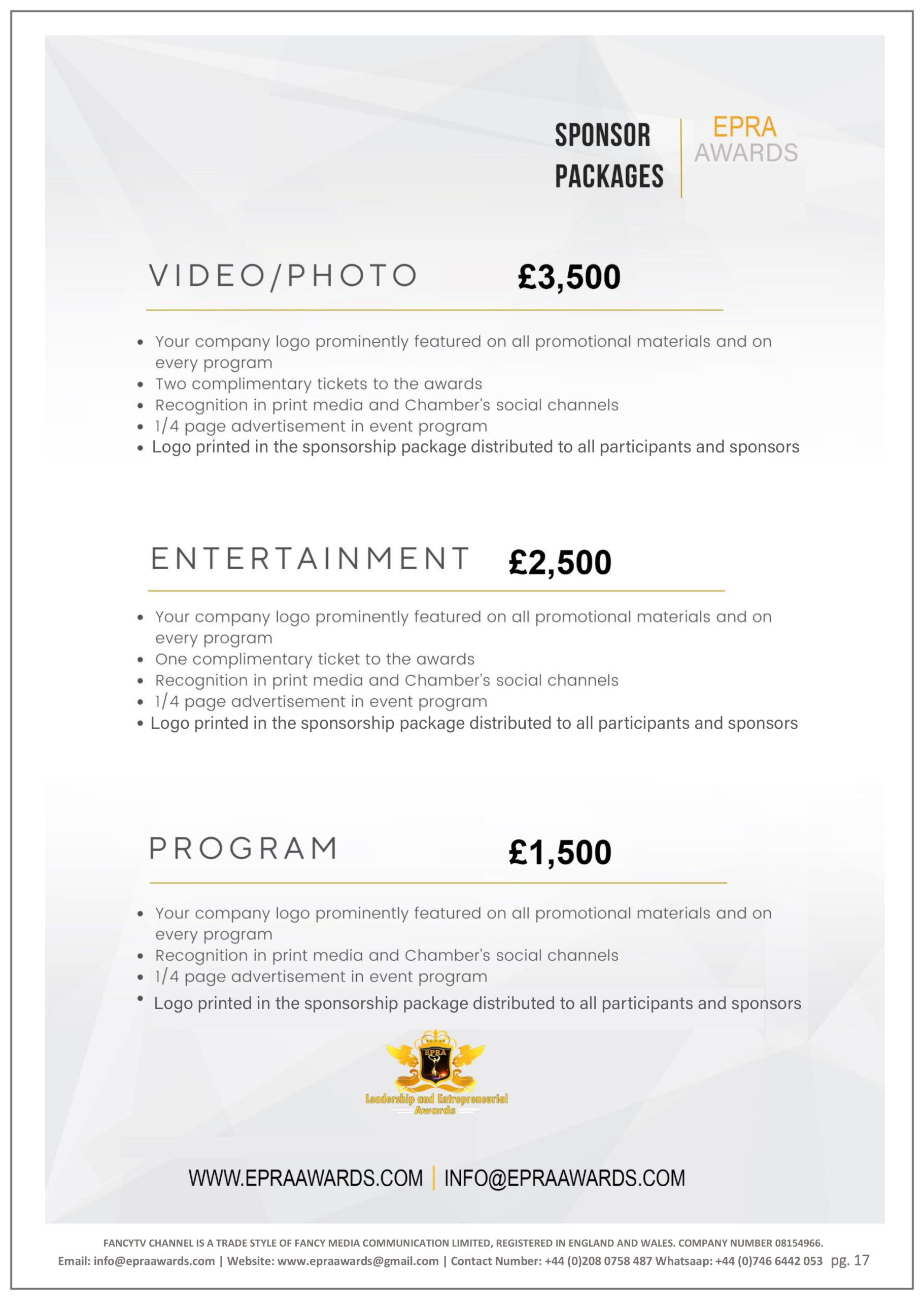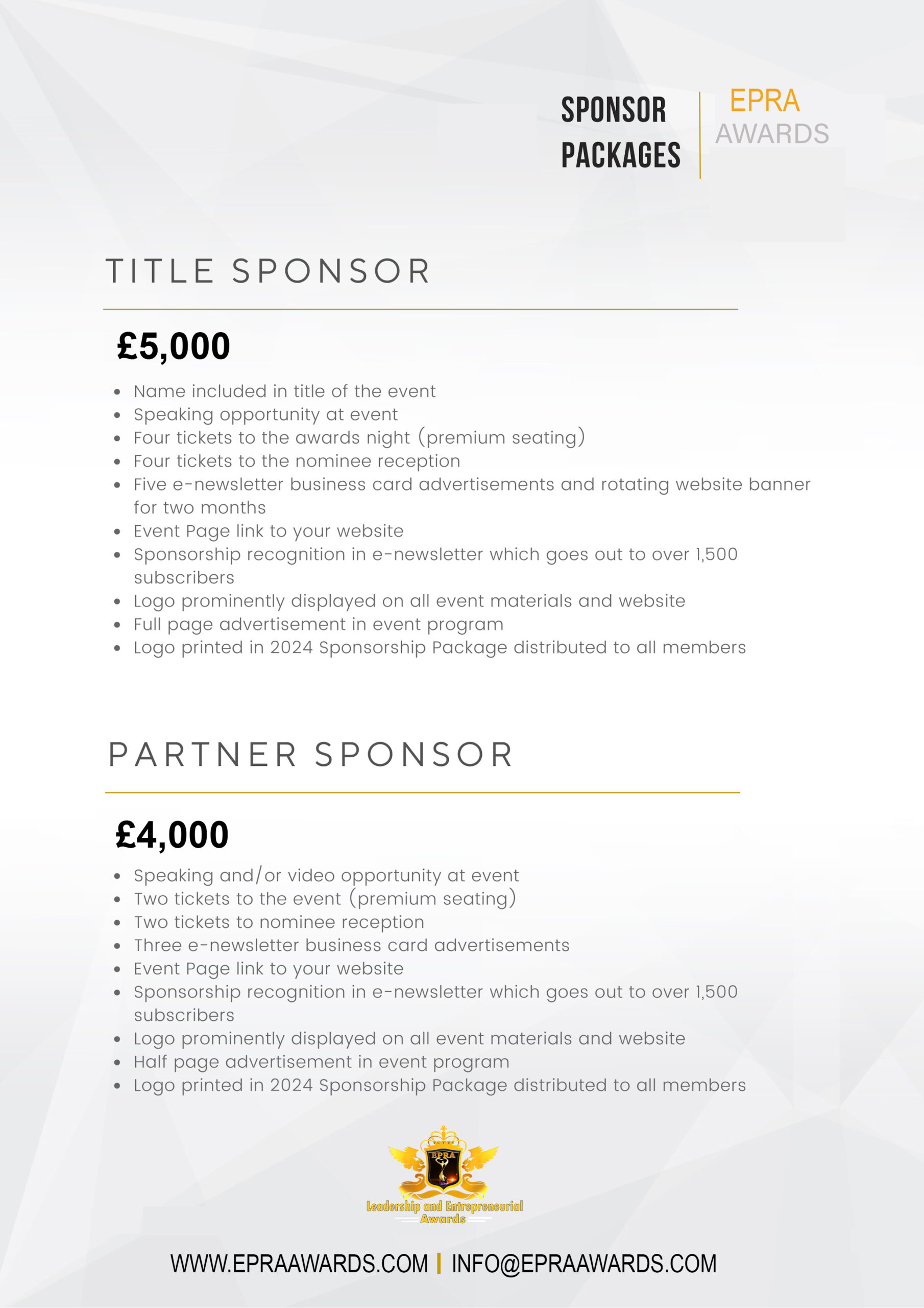 For Sponsorship, fill out the form below or email: info@epraawards.com or call 07491993874.